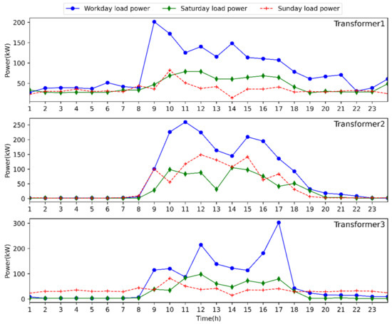 In this paper, the optimal configuration of the decentralized ESS for an industrial park microgrid with three transformers is taken into account. As for the daily load of each load node, it is initially categorized into working day, Saturday, and Sunday loads. The load data of each transformer, which total 14 curves and include the load data on Saturday and Sunday in addition to the normal load data for the previous 12-month working days, are used to predict the load on wet days. Figure 5 displays the three transformers’ typical daily load.