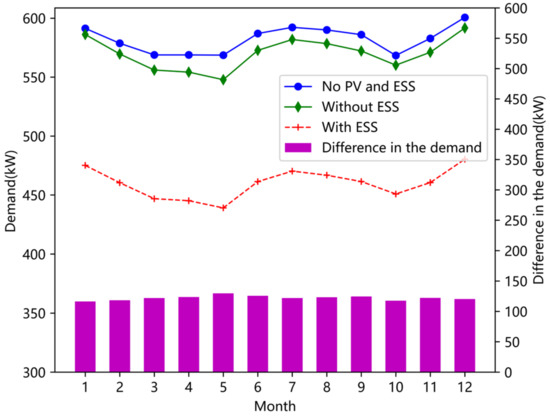 Figure 6 compares the demand power of the park with and without ESS to analyze the impact of ESS on reducing demand power. When compared to situations without PV, installing PV can somewhat lower the demand power. Due to the impact of the weather conditions, PV production varies widely and randomly and contributes little to lowering the demand power. The demand power of the industrial park can be greatly reduced with ESS. As can be seen from the figure, the demand power is reduced by more than 100 kW per month.