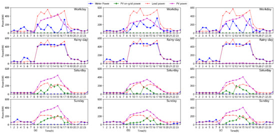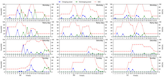 The optimal charging and discharging power, and SOC of each ESS under workdays, rainy days, Saturdays, and Sundays are depicted in Figure 7. From the figure, it can be observed that ESS has substantially larger charging and discharging power on workdays and rainy days than it does on weekends. The load curves are comparatively flat, and the PV outputs are high on Saturday and Sunday, which explains why. The primary function of ESS in this scenario is to arbitrage through local PV usage. Moreover, we can see that the operation of ESS satisfies the SOC constraint.