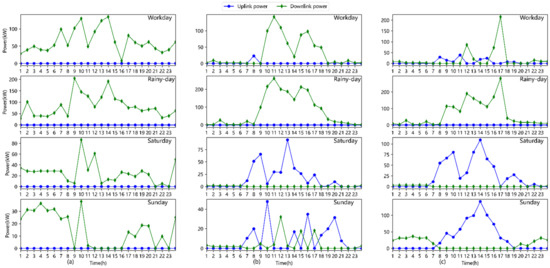 Uplink and downlink power of different transformers throughout workdays, rainy days, Saturdays, and Sundays. (a) Uplink and downlink power of transformer1; (b) uplink and downlink power of transformer2; (c) uplink and downlink power of transformer3.