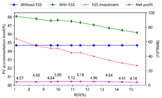 In this subsection, the optimal configuration of decentralized ESS under different ROIs is investigated. Figure 10 illustrates the relationship between the net profit, PV accommodation level, and ROI of the park. The figure shows that when ROI increases, the amount of PV accommodation and the ESS investment are on the decline. This is due to the fact that a high ESS installation would not provide the park with a significant return, and as a result, the ESS’s capacity is constrained by a greater ROI requirement. Additionally, with the increase in ROI, the net profit increases first and then decreases. Moreover, it is interesting to note that ESS investment and PV accommodation level have a positive correlation. The simulation results also show that the suggested strategy can optimize the park’s return while ensuring a specific level of investment.