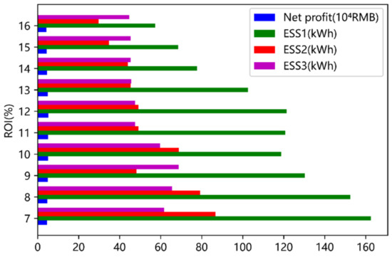 The optimal capacities and net profit of ESS under different ROIs.