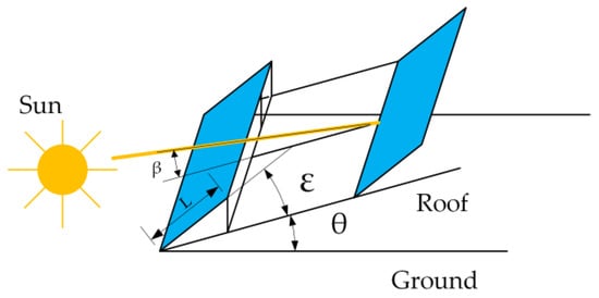 Two types of roofs with different appearances, named flat roofs and pitched roofs, have both been widely utilized in typical univerisity buildings depending on the surrouding climate and building types. The schematic diagram of the a PV module installed on a flat roof is shown in Figure 2. In this case, the PV module spacing is calculated using the sun’s azimuth angle at 3 pm on the local winter solstice in order to minimize the impact of mutual shading among PV modules [19]: