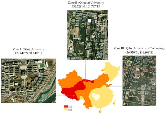 The power generation efficiency, the location, and the array layout of PV systems depends on the solar radiation received on the solar panel surfaces. Due to a vast land mass with diverse meteorological conditions, four major solar radiation zones have been identified from Zone I to Zone IV in China for targeting solar energy utilization [25]. In order to evaluate the technical feasibility and economic benefit of university campus PV systems, Tibet University in Lhasa City, Qinghai University in Xining City, and Qilu University of Technology in Jinan City are selected as study cases, with the location and satellite images shown in Figure 4. Zone IV is not taken into account in the present study due to less solar radiation. The coordinates of three selected universities are (29.647° N, 91.146° E), (36.728° N, 101.747° E), and (36.559° N, 116.804° E), representing Zone I, Zone II, and Zone III irradiation areas in China, respectively.