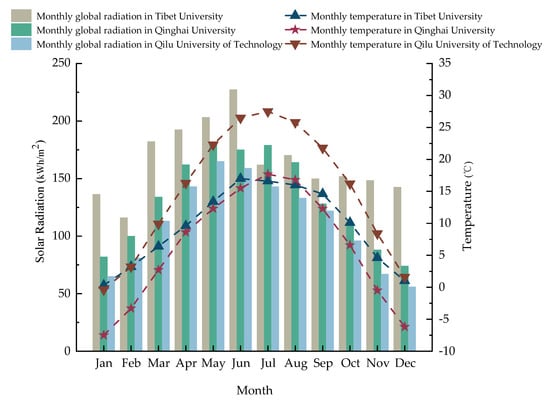 The main meteorological parameters of the three studied university are shown in Figure 5. The annual outdoor average temperature at Tibet University, Qinghai University, and Qilu University of Technology is 9.4 °C, 6.3 °C, and 14.9 °C, respectively. The annual global horizontal irradiation of above three universities reaches 1983 kWh/m2, 1576 kWh/m2, and 1342 kWh/m2, respectively. It can be obviously observed that, Tibet University has the most solar irradiation, followed by Qinghai University and Qilu University of Technology, which is consistent with their located solar radiation zones. Tibet University has the highest monthly global horizontal radiation of 228 kWh/m2 in June and the lowest radiation of 116 kWh/m2 in February. Both Qinghai University and Qilu University of Technology reach the highest irradiation values in May with 181 kWh/m2 and 165 kWh/m2, and the lowest irradiation levels in December with 74 kWh/m2 and 56 kWh/m2, respectively.