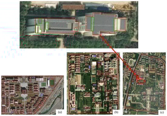 Satellite images and area identification of studied cases via manual screening by LocaSpace Viewer: (a) Tibet University; (b) Qinghai University; (c) Qilu University of Technology.
