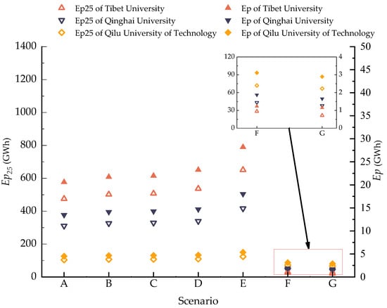 Figure 8 is the PV output during lifetime of three studied universities under seven scenarios. For the same university, the annual power generation and total power generation within a 25-year lifetime under scenario E > scenario D > scenario C > scenario B > scenario A, because the scenario E shows the highest radiation intensity per area under the condition of the same PV-installed capacity. For flat rooftops under scenarios A–E, Tibet University has the highest annual power generation, following by Qinghai University and Qilu University of Technology. This can be attributed to the highest solar radiation intensity and most flat rooftop areas in Tibet University. The maximum of 28.19 GWh, 18.03 GWh, and 5.36 GWh of annual power generation capacity can be obtained in Tibet University, Qinghai University, and Qilu University of Technology, respectively. Under scenario E, the annual power generation and total power generation within 25-year lifetime of both Tibet University and Qinghai University are the highest in comparison with another four configurations, which can also be attributed to the highest solar radiation under scenario E. The same conclusion can be drawn for Qilu University of Technology, but the increase rate is much lower than another two universities due to lower solar radiation.