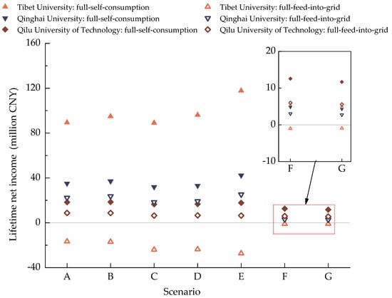 For PV systems installed on the pitched rooftops in scenarios F and G, the highest lifetime net income can be achieved under scenario F for all three study cases, except the PV systems installed in “full-feed-into-grid” mode in Tibet University. Although scenario F has features of slightly lower solar radiation and higher investment cost compared to scenario G, the lifetime net income under scenario F is still higher than that under scenario G, attributed to its higher installed capacity for PV systems and more generated electricity. When the PV systems are installed parallel to the pitched rooftop under scenario F, the lifetime net income of Tibet University, Qinghai University, and Qilu University of Technology is 5.33 million CNY, 4.83 million CNY, and 12.58 million CNY, respectively.