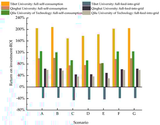 Figure 10 presents the return on investment of PV systems under seven scenarios in three universities. Under seven scenarios, the ROI of PV systems installed in “full-self-consumption” mode is always higher in comparison with “full-feed-into-grid” mode, which can be attributed to the fact that the local benchmark price of solar-powered electricity is lower than the residential electricity tariff when the above two modes have the same power generation capacity. Furthermore, the highest ROI can be achieved at 208% and 101% under scenario B when the tilt angle is adjusted twice every year for both Tibet University and Qinghai University. Low frequency adjustment of PV modules corresponds to low operation cost; thus, PV systems installed under scenario B can effectively utilize the solar radiation of these two zones to enhance the ROI. For Qilu University of Technology located in solar Zone III, the highest ROI can be obtained at 124% under scenario A thanks to the lowest investment cost in comparison with other scenarios. When it comes to the PV systems installed on the pitched rooftops, the highest ROI is achieved under scenario G with the lowest PV system capacity and the highest PV power generation per capacity, which is 204%, 99%, and 123% in Tibet University, Qinghai University, and Qilu University of Technology, respectively.