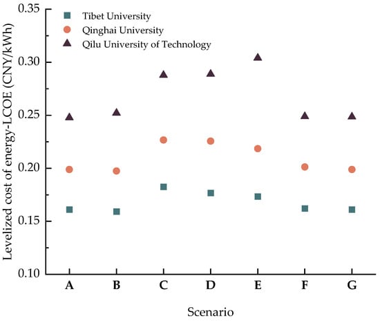 Figure 11 shows the levelized cost of electricity of PV systems installed in three universities under seven scenarios. Tibet University and Qinghai University have the lowest levelized cost of electricity in Scenario B, and Qilu University of Technology has the lowest levelized cost of electricity in Scenario A. Under the same scenario, the LCOE of the PV systems installed in Qilu University of Technology is the highest, following by Qinghai University and Tibet University, corresponding to the solar Zone III, II, and I, respectively. The results indicate that the LCOE of the proposed PV systems becomes higher with the decrease in solar radiation.