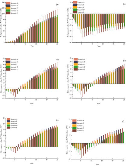 Net present value of PV systems installed on the flat rooftops in the three studied universities under five scenarios: (a) “full-self-consumption” mode in Tibet University; (b) “full-feed-into-grid” mode in Tibet University; (c) “full-self-consumption” mode in Qinghai University; (d) “full-feed-into-grid” mode in Qinghai University; (e) “full-self-consumption” mode in Qilu University of Technology; (f) “full-feed-into-grid” mode in Qilu University of Technology.