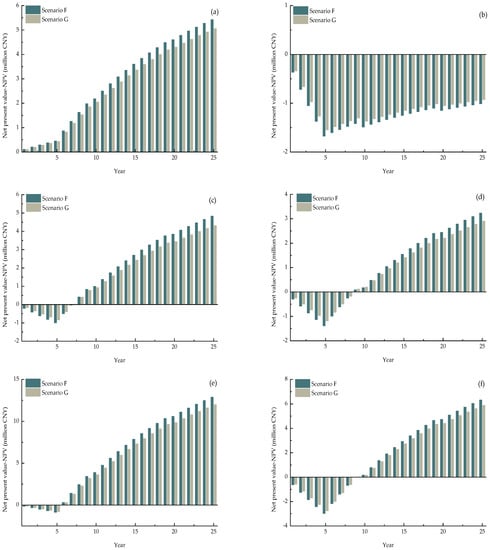 Figure 13 is the NPV of PV systems installed on the pitched rooftops of three universities. Similarly, like in Figure 12, the payback period of PV systems in “full self-consumption” mode is still always shorter than that in “full-feed-into-grid” mode for all three studied universities both under scenarios F and G. In “full self-consumption” mode, the payback period for PV systems installed in Tibet University, Qinghai University, and Qilu University of Technology is 1 year, 6–7 years, and 5 years, respectively. In “full-feed-into-grid “ mode, the payback period for PV systems installed in Qinghai University and Qilu University of Technology is both 8 years. Figure 13b shows that NPV is always negative for PV systems on pitched rooftops of Tibet University, due to a too-low local benchmark price of solar-powered electricity in “full-feed-into-grid” mode.