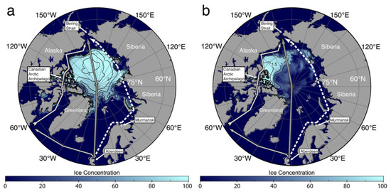 Model 2010–2019 (a) and 2030–2039 (b) sea ice concentration (%, shades of blue) and thickness (indicated contours) during the navigation period (June–October), according to the RCP 8.5 NEMO forecast. Source: [53]. Note that this figure shows the Arctic shipping routes: NSR (dashed arrow), Central Northern Passage (dark gray arrow), and Northwest Passage (light gray arrow).