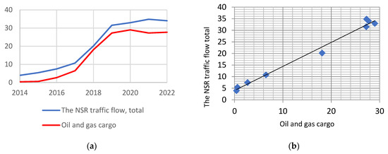 Volumes of oil and gas cargo transportation along the NSR in 2014–2022, mln t. (a) Factual data; (b) Correlation field. Source: compiled by the author according to the data of [6,38,44,57,58].