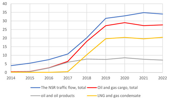 The NSR traffic flow in 2014–2022 by type of cargo, mln t. Source: compiled by the author according to the data of [6,38,44,57,58].
