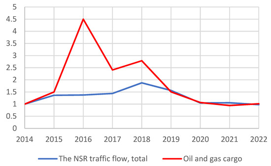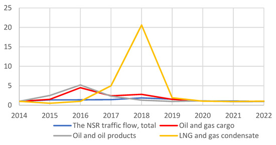 Chain indices of the total volume of the NSR traffic flow and oil and gas cargo transportation in 2014–2022 units. Source: compiled by the author according to the data of [6,38,44,57,58].