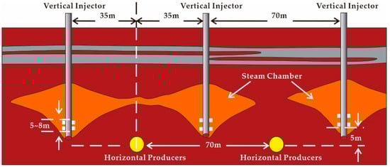 The research area in this study (the D84 study area) has a shallow burial depth, poor diagenesis, a loose rock structure, and low maturity, resulting in relatively good reservoir physical properties. However, the heterogeneity of the reservoir varies at different layers, in which different SAGD development well combination modes can be selected according to the reservoir characteristics. The effective thickness of the top reservoir X1 ranges from 10 to 25 m, the average porosity ranges from 22% to 31%, the average permeability ranges from 1000 to 2500 mD, and the reservoir heterogeneity coefficient is 0.46, which depicts a homogeneous reservoir that is suitable for double horizontal well SAGD development. Meanwhile, the effective thickness of the bottom reservoir X6 ranges from 42 to 85 m, the average porosity ranges from 20% to 27%, the average permeability ranges from 800 to 1100 mD, and the reservoir heterogeneity coefficient is 1.14, which depicts a heterogeneous reservoir suitable for SAGD development with a combination of vertical and horizontal wells [47].