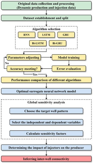 The overall workflow is presented in Figure 2 and has four parts: (a) collect and process the original data and establish a dataset for model training; (b) develop a well-fitted production-injection surrogate model by testing and evaluating different algorithms; (c) determine the effect of the injectors on the producer based on a global sensitivity analysis method; and (d) infer the inter-well connectivity derived from the effects.