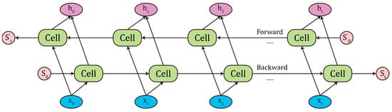 The bidirectional recurrent neural network (Bi-RNN) was invented and introduced by Schuster and Paliwal [50]. The Bi-RNN was designed to enhance the amount of input information by connecting two hidden layers, enabling some neural networks to capture the sequence information from both a backward direction (future to past) and a forward direction (past to future). Subsequently, the bidirectional recursive structure improved LSTM and the GRU to form Bi-LSTM and Bi-GRU, as shown in Figure 5.