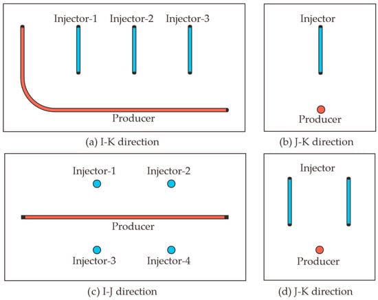 The selection of variables is an important part of the process of building an injection-production surrogate model. Linear patterns and five-spot patterns with vertical wells as the injection wells and horizontal wells as the production wells are two typical well layouts in the X6 reservoir, as shown in Figure 6. Several variables were selected to develop the surrogate model and to determine the interaction between injectors and producers, as presented in Table 1.