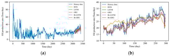 In order to build a more accurate surrogate model, the RNN algorithm and its four variant algorithms mentioned above were tested based on optimized model parameters. Figure 7 presents the historical gas production of the producer and the prediction results of different algorithm models. The actual historical data for the first 3000 days since the producer was put into production were input into the model training, and the data for the last 300 days were used as the test set to check the model accuracy.