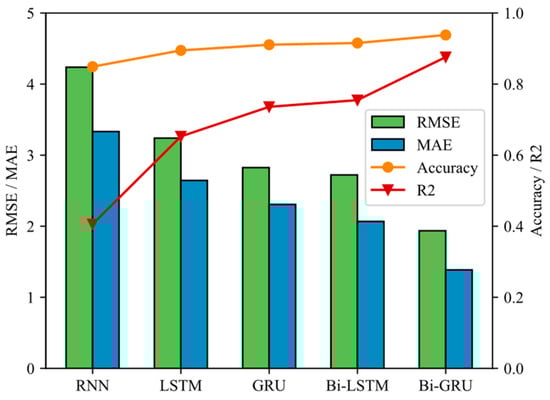 The calculation results for the RMSE, MAE, and accuracy for the prediction and the actual data are shown in Figure 8. The Bi-GRU algorithm achieved the best performance and the best fitting effect among these algorithms. Comparisons elucidated that, on one hand, the prediction accuracy of the simple RNN algorithm was lower than that of its variants; on the other hand, the introduction of the bidirectional recursive neural network significantly enhanced the model performance in the time series production prediction problem. Therefore, the gas production prediction model based on the Bi-GRU algorithm was employed as the surrogate model for the analysis of connectivity between wells in this study.