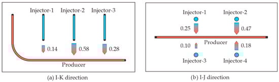 The inter-well connectivity results of the two typical well layouts were quantified based on the proposed method. Figure 9a presents the effect of three injectors on the producer in the linear pattern, and Figure 9b illustrates the relationship between the four injectors and the producer.