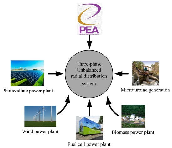 The DG units are installed in the distribution systems to compensate the network operation. The power output of DG can solve the problem of reliability and the power quality of the system. The general definition of DG is the power unit connected to the distribution system [1]. The relation of the power distribution system of the Provincial Electricity Authority (PEA), Thailand, and DG is shown in Figure 1.