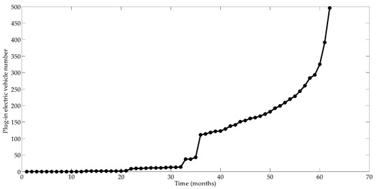 According to the report of [11], on 28 February 2023, Udon Thani, Thailand, had 496 PEVs and 25 charging stations. As an annual one-off, this PEV number is a 158% increment. To illustrate, the graph in Figure 2 shows the monthly number of PEVs from 2018 to 2023. Thus, PEVs are growing in popularity as more efficient low-emission alternatives to conventional fuel-based automobiles. With the increasing popularity of electric vehicles, there is a growing need for a PEV charging infrastructure to support the expanding PEV market. However, the introduction of PEV charging has implications for the power losses of the distribution system [12]. Power losses in a distribution system occur due to various factors, including resistance in transmission lines, transformer losses, and losses in distribution lines. Adding PEV charging stations to the distribution system can lead to increased power losses due to the additional load on the system.