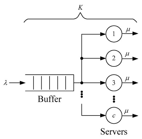 The M/M/c/K queue is the queuing system that has c servers. The limited capacity is equal to K customers. When arrival customers are less than c, they will receive the service immediately. Otherwise, customers may be waiting in the queue or exit the system. The structure of the M/M/c/K queue is shown in Figure 3. The probability of k customers can be calculated by using Equation (2). In the case that all servers service other customers or are not ready to serve, some customers may not enter the queue and exit the system. Thus, the probability that the system is out of service can be calculated using Equation (4).