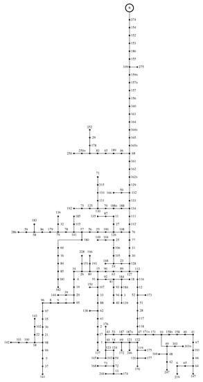 The system data of the study were obtained from the unbalanced radial distribution system of the Provincial Electricity Authority (PEA), Udon Thani, Thailand [23]. The selected feeder is the 4th circuit of the Nonsung station along Thaharn Road, in the Muang District, Udon Thani, Thailand. The topology of the feeder is shown in Figure 5. The Udon Thani Municipality buys electricity from the DG through the feed line of the 4th circuit. The information of the Energy Regulatory Commission states that the renewable energy potential of the Udon Thani Province in 2018 has the capacity of generating electricity as shown in the rated reactive power of the biomass DG (Qpv1, Qpv2, Qpv3, Qpv4) with the maximum power factor equal to 0.95. The maximum rated apparent power of the 4 DGs are 12.375 MVA 18.750 MVA 24.500 MVA, and 37.500 MVA, respectively [24].