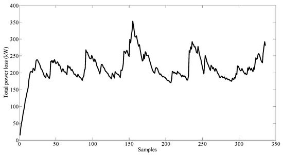 The boundary of the control variables is based on the data of the test feeder and charging stations in Germany and Sweden. The base load curve of test feeder for April 2018 is shown in Figure 6. The simulation of the optimal power loss is calculated every 30 min from 0–24 h for 7 days. Therefore, the number of simulations is 336 times. The optimization problem calculating the optimal value of the total power loss when PEA purchases electricity from the distributed generation by considering the penetration level of the load PEVs are shown in Equation (17).