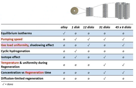 Matrix of the main aspects of interest, experimentally investigated on different scales of pump sizes. Each disk has a 25 mm diameter, 2 mm thickness and contains 3.5 g of ZAO® getter.