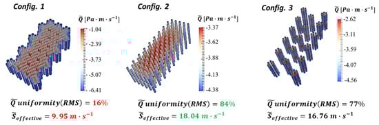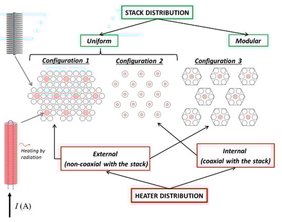 Figure 2 shows the general schemes investigated in advance, including the different heater solutions. The basic idea was to explore different approaches about getter stack distribution (dense, sparse or modular) and heater positions (coaxial with the stack or not). All three configurations were evaluated regarding gas load uniformity, as well as their temperature behavior during heating, regeneration and cooling. As an example, Figure 3 shows a simulation of the gas load distribution for hydrogen at 27 °C. Here, is the throughput per unit area and shows different values at different positions. The statistical variations of give a uniformity. It is illustrated that configuration 1 is clearly worse in terms of gas load uniformity. This is also linked with a broader temperature distribution, in particular towards the external parts of the arrangement [5]. The differences between configurations 2 and 3 are generally smaller. Although configuration 2 was found to perform slightly better in terms of gas load uniformity and pumping speed, the cooling behavior and particularly the capacity (twice the getter mass per unit area) were found to be better for configuration 3. Furthermore, configuration 3 resulted in a drastically reduced number of heater elements, cabling, feedthroughs and controllers. On top of this, the single units of configuration 3 were based to some extent on commercially available cartridges, which added advantages for scalability, modularity and reliability. This is why configuration 3 was finally chosen. The cartridge geometry was a result of an optimization study [7] and therefore it was used as the smallest unit. Additional detailed tests and analyses were carried out on the cartridge, after it was selected as the basic module for the pump.