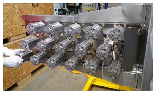 Following the decision concerning the cartridge-based pump design, the detailed engineering and manufacturing began under the responsibility of SAES with the support of the computational engineering part of Consorzio RFX. The cartridge design is derived from the commercial one, with 45 disks on each stack and six stacks in a cartridge. Moreover, the heater elements are a special development by SAES for this task providing two redundant Ta filaments in each cartridge which can be switched in case of a failed one. This improvement was designed for an application with demanding requirements for a high reliability and low maintenance. Figure 4 shows these cartridges at the fully assembled pump with 17 units in total and with a size of 1 m in length and 0.4 m in height. The decision for this size and the number of cartridges was based on the need for scalability. This means that the pump had to be manufactured large enough to be representative regarding the application. The size of 17 cartridges was herewith a balance between an extended pump arrangement, not only consisting of outer cartridges (on edges or corners), but limiting at the same time costs, the size for handling, the required heating power for regeneration and other aspects, such as regeneration, duration or hydrogen inventory in the test facility.