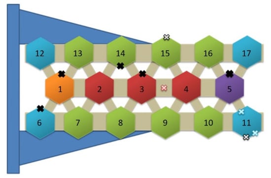 Pump scheme showing all 17 cartridges grouped in five master-slave sections (light blue = corner, green = outer edge, red = innermost, orange = inner edge, purple = inner edge but with a different heater design for testing purposes). The crosses represent the thermocouples for the temperature reading, the cartridge numbering is relevant for Section 7.