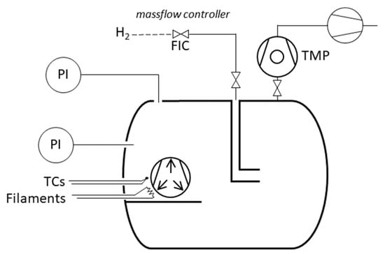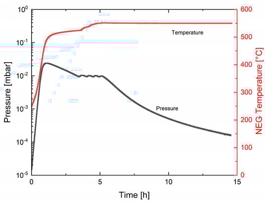 Following each experimental run, the dosage of hydrogen was stopped at a desired achieved inventory in the getter. Therefore, the duration of an experiment resulted from the combination of gas flow (related to the aimed pressure during sorption) and the achieved inventory, and ranged from 4 to 28 h. At some time afterwards, the regeneration could be started: the getter was heated up to the 550 °C standard temperature in ~1 h by controlling the heating ramp according to the maximum pressure in the TIMO for TMP protection. When the regeneration temperature was achieved after ~1 h, it was kept at that temperature for several hours until the pressure decreased to a certain value, which corresponded to the remaining inventory of hydrogen in the getter, providing the starting inventory for the next sorption. Once the getter completed heating, the NEG pump and TIMO had cooled down passively for 8–14 h until it reached a getter temperature that was equal to or below the getter temperature desired for the next sorption.