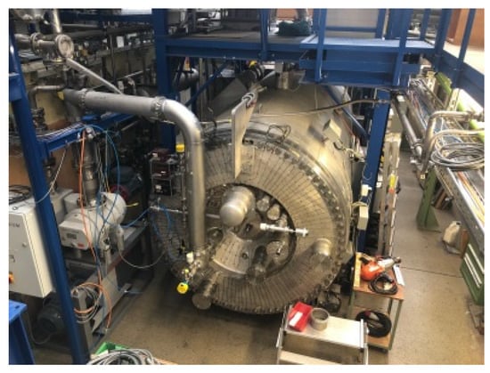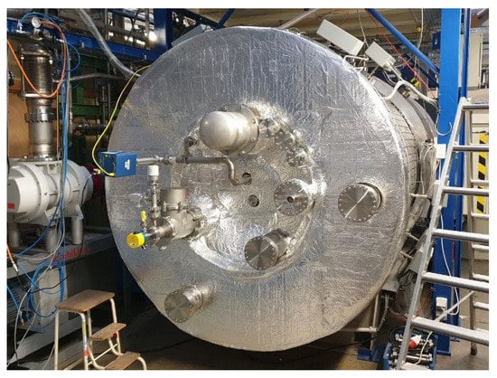 The TIMO (test facility for the ITER model pump) facility at KIT was established more than 20 years ago for the testing of large cryogenic pumps for ITER [8]. Today, it is still the perfect facility for the large testing of pump units requiring a significant amount of hydrogen throughput. It offers a 10 m3 cylindrical vessel of ~1.7 m inner diameter and a hydrogen inventory certification up to 20 mol. A schematic diagram, showing the most important subsystems, is given in Figure 6. Figure 7 shows TIMO looking on its main flange after the installation of the NEG pump, but before the installation of all of the connections. Figure 8 shows the bird’s eye view of the facility and Figure 9 shows the open TIMO vessel during the NEG pump installation.