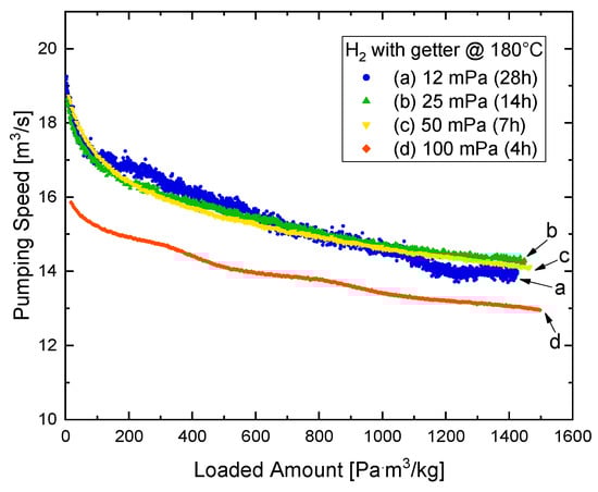 Pumping speed curves at different pressures with the growing inventory of H2 with ZAO® at 180 °C. Different pressures were established by different constant mass flows resulting in different durations to reach the same inventory. The effect of the decreasing pumping speed at higher pressures, caused by diffusion limitation from the getter surface into the bulk, becomes significant only for pressures >50 mPa.