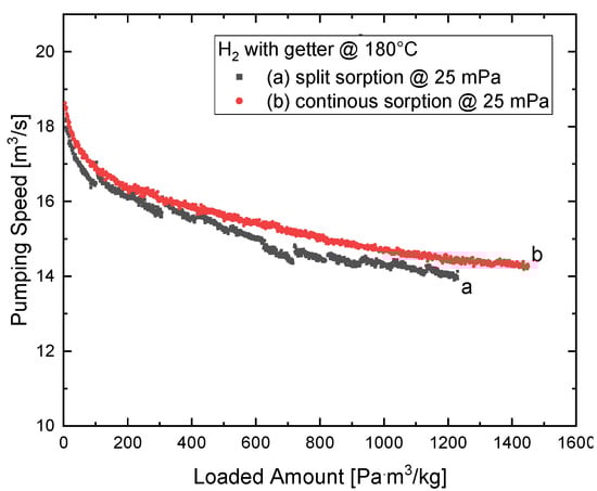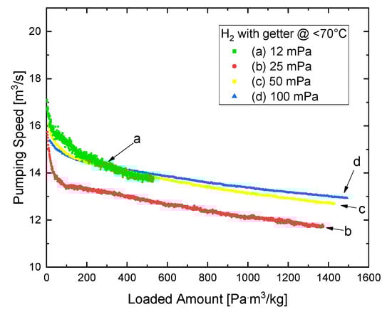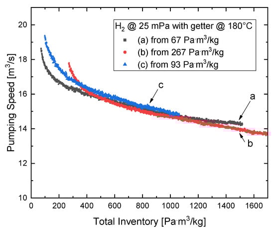 The effect of decreasing the pumping speed with the growing inventory has already been shown. Additionally to this effect, experiments with a different starting inventory, remaining from the previous regeneration, have been compared. In Figure 16, it can be seen that the behavior—in terms of the total inventory—is comparable with the curves shown in Figure 10, as long as the different starting conditions of the getter are properly considered (by shifting along the loading/inventory x-axis). This also implies a very good repeatability of the NEG pump performance.