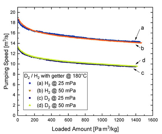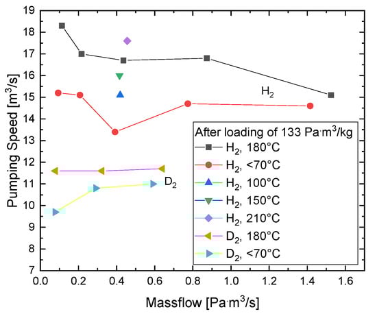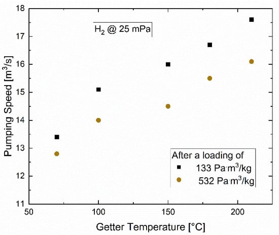 Clearly, the getter is working also at ambient temperature, where it is preferred from a pure energy consumption point of view. However, its capacity for non-hydrogens increases significantly with higher temperatures. Furthermore, its potential capability to preserve the performance for hydrogen under a non-hydrogen impurity background is improved. Hence, the choice of the ideal getter temperature during pumping results from a trade-off, which considers thermal aspects with performance aspects. In support of this, an experimental campaign was conducted at different getter temperatures and the other parameters remained constant. In Figure 12, the pumping speed values of each of these experiments at a rather low inventory of 133 Pa·m3/kg are summarized. Based on this, the getter temperature of 180 °C was decided to be chosen for the standard experiments, along with 70 °C (or lower, which is equivalent to the ambient temperature, from a performance point of view). The interpretation of this effect has two aspects. Firstly, the capacity for non-hydrogens increases significantly, preserving an improved performance for hydrogen. Secondly, the pumping speed for hydrogen increases with higher getter temperatures due to a faster diffusion of hydrogen into the bulk, resulting in a smaller concentration close to the surface [9].