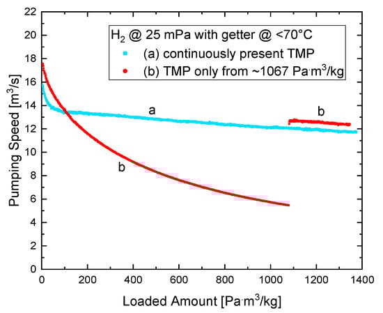 Hence, an experiment was performed to address the question about a potential degradation of the performance by the presence of non-getterable gases besides hydrogen. The temperature was chosen to be cold (<70 °C) in order to emphasize the impact of non-hydrogenics. This experiment did not follow the standard procedure described above, but another scheme, as indicated in Figure 13: while the getter was pumping H2, the TMP was separated from the TIMO vessel with the gate valve and, consequentially, a continuous rise of the signal of the pressure gauge (gas independent capacitance manometers) in TIMO was observed. This rise, however, comes from the accumulation of the non-getterable impurities, which add themself to the H2 partial pressure. Following ~11 h of dosage up to 1067 Pa·m3/kg, the gate valve was re-opened and the TMP pumped down the partial pressure of non-getterables instantaneously. As shown in Figure 13, the NEG pumping speed fully recovered to the expected value (see Figure 11), for the present time and accumulated inventory. Therefore, it can be concluded, that the presence of the high background during sorption did not cause any real reduction in performance for H2 pumping. Moreover, the role of the TMP in pumping the getterable background species is not relevant for preserving the H2 pumping speed. The source of the non-getterable gases is the unavoidable low contamination in the gas dosage of a few ppm. It can be assessed that every ppm of non-getterables in the gas supply creates a pumping speed drop of 4% after this long period of 11 h. This strong effect underlines again the need for a continuously running second vacuum system supporting the NEG pump in an application. The difference in the initial pumping speed of the curves is not caused by any background effect of this experiment, but only due to slightly different start inventories.