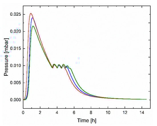 For comparability of the experiments, similar starting conditions were needed. This means that every regeneration was carried out, such that the remaining residual inventory was 67 Pa·m3/kg. The amount of gas desorbed by the NEG pump was calculated by the pressure measurements and the known TMP pumping speed as a function of pressure. The uncertainties of these two quantities contribute to an uncertainty of the quantity of extracted gas in the order of 10–15%. Figure 19 shows the comparison of three regenerations under identical conditions and the histories to demonstrate the very good repeatability of the regeneration process under the chosen procedure.