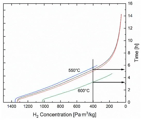 The influence of the different regeneration temperatures on the needed regeneration time was also investigated, and is shown in Figure 20. It can be seen that, for example, a regeneration at 550 °C reduces, in the given conditions in TIMO, the hydrogen inventory in the getter to the remaining 933 Pa·m3/kg in 2 h or 533 Pa·m3/kg in 4–4.5 h.