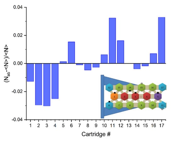 The outcome of this task is a capture factor of 7% for a complete cartridge. It could also be shown that the sticking factor of the getter is identical for H2 and D2. The investigated shadowing effect between the 17 cartridges in the investigated arrangement (numbering see Figure 5), namely the mechanism that a neighboring cartridge could hinder the gas flow to the next one while a cartridge at the pump edge is more accessible, was found with ±3% being negligible. Figure 23 shows the ratio of (Nab − <N>)/<N>, where Nab is the absorbed number of test particles by each NEG cartridge and <N> the average number of caught particles for all cartridges, and it is easy to see the shadowing effect on the cartridges: