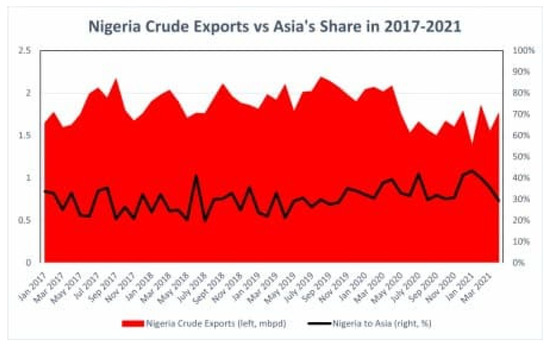 Furthermore, the power industry in Nigeria solely depends on natural gas which is a significant source of fuel in the country. It is articulately stipulated that the Energy Commission of Nigeria Act and National Gas Policy are responsible for policies and implementations on energy and gas, respectively. The government is dedicated to the power and natural gas sector in order to drive important industrial development through regulation of the market in the country. Undoubtedly, the policies and regulations of the government have a significant impact on power and natural gas because the participants in the markets are expected to comply with the policies and regulations of the government. Gas producers and international oil companies are the prime market participants that operate on the basis of sole risk or under contractual agreement. For instance, the policies and regulations specifically mention that they can operate under petroleum ventures and production-sharing contracts (PSCs) with the Nigeria National Petroleum Corporation (NNPC), which is regarded as a national oil company [31,32,33]. In addition, the policies and regulations identified the roles of the marketers and transporters of local gas distribution companies in the gas industry. There are other participants in the marketability of natural gas and different companies meant for downstream gas utilization such as power generation companies as well as independent power producers (IPPs) who also play significant roles. The power sector is regulated by the Nigerian Electricity Regulatory Commission (NERC) and the Nigerian Oil and Gas Industry Content Development Act which are responsible for the growth of local content in various arrangements, operations, activities, projects, and transactions in the oil and gas industry [34,35]. Finally, one can see Nigeria’s Crude Exports vs. Asia’s Share in Nigeria’s Exports from 2017 to 2021 (million barrels per day, %) as demonstrated in Figure 1.