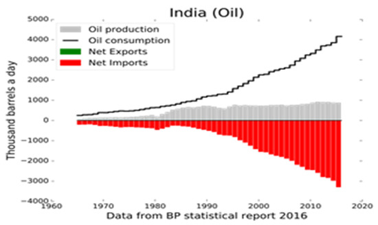 Furthermore, in India, the power and natural gas exchange market has been making a tremendous improvement, and the roles of regulators as manifested in the policies and regulations cannot be underrated. It has been mentioned that integrated products specifically from power plants would enable the country to buy gas from exchanges coming from the gas industry and consequently sell electricity in exchange for power as a single transaction. Similarly, in 2020, the Indian first gas exchange was given the responsibility to achieve the expectations of the government through the availability of gas which would enable the country to create a free market and promote a gas-based economy. The literature posits that the current regulations and guidelines of the government in India are that Oil India Limited (OIL) is expected to have freedom in marketing its product and the Ministry of Petroleum has been intensifying efforts towards the development of the gas markets in the country. There is a proposition by the government that some companies such as fertilizer companies are expected to specify their need for gas through exchanges. In addition, the literature contends that India strives to increase their share of natural gas in the energy market from 6.7% to 15% by 2030. Currently, crude oil represents 27.91% of the total consumption of energy in India [42,43]. Nonetheless, there is a gap between the demand and supply of crude oil which is fulfilled via the importation of the product. Figure 2 shows India’s reliance on oil as the source of gross domestic product (GDP).