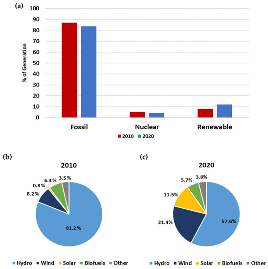 Most countries of the world have been trying to comply with the Paris Agreement on the international investment in renewable energy resources. The literature contends that there has been a drastic decrease in fossil fuels and the usage of nuclear power between 2010 and 2020. This is a result of the proliferation in the use of renewable energy sources. It is important to reiterate that the report by International Energy Agency (IEA) contends that the consumption of renewable energy by 2030 will rise to 53%. These data demonstrate that there is likely a security threat with regard to energy in the nearest future. It is on this basis that there is a need to assiduously work toward a policy that will address the future threat emanating from a need for energy. It should be further reiterated that there are global demands for fossil fuels and the literature acknowledges that the said demands have been met over a decade ago. Nonetheless, there has been a transition from the use of fossil fuels to the use of renewable sources of energy as an integral part of energy stability. Notably, hydropower significantly contributed to a larger part of the 8% consumption of sources of renewable energy. In addition, there has been a significant increase in solar sources of renewable energy. This progress is the manifestation of an intense global effort to foster the utilization of renewable energy sources. Hence, the sustainability of energy can only be achieved when efforts are made to decrease fossil fuel energy generation. Figure 3 shows the global growth of Fossil, nuclear, renewable energy.