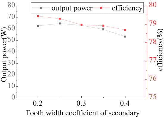 Relationships between output power and efficiency with the tooth width coefficient of the secondary tooth.