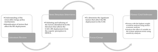 Stage I: Literature review—the literature review aided the study in developing an understanding of the most popular renewable energy policy mechanisms and factors that impact the successful implementation of RE energy deployment around the world and especially in the UAE.